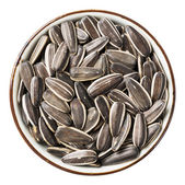Nasiona słonecznika w drewnianej misce izolowane na biało, widok z góry