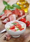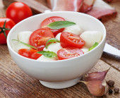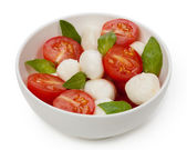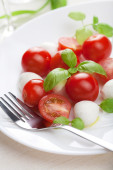 Sałatka Caprese z mozzarellą, pomidorem, bazylią na białym talerzu