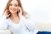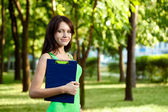 Szczęśliwa kobieta siedzi pod drzewo zbliżenie twarzy