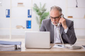 Dobrze ubrany senior manager przegląda dokumenty podczas rozmowy telefonicznej we współczesnym biurze.