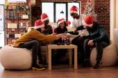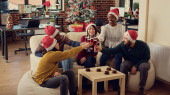 Grupa młodych współpracowników delektujących się świątecznymi drinkami i śmiechem podczas świąt Bożego Narodzenia.