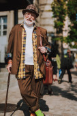 Modny starszy pan pewnie przechadza się w eleganckim, swobodnym ubraniu, obejmując jesienną atmosferę.