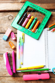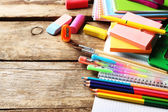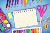 Notatnik i jasne szkoły piśmiennicze na starym drewnianym stole