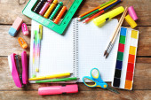 Zdjęcie "Notatnik i jasne szkoły piśmiennicze na starym drewnianym stole" może być wykorzystywane do celów osobistych i komercyjnych zgodnie z warunkami zakupionej licencji Royalty-free. Obraz jest dostępny do pobrania w jakości wysokiej rozdzielczości do 5760x3840.