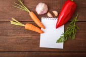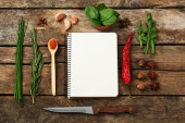 Otwórz książkę kucharską z świeżych ziół i przypraw na drewniane tła