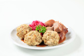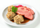 Zdjęcie "Roast pork with Tyrolean dumplings and red kraut" może być wykorzystywane do celów osobistych i komercyjnych zgodnie z warunkami zakupionej licencji Royalty-free. Obraz jest dostępny do pobrania w jakości wysokiej rozdzielczości do 5760x3840.