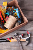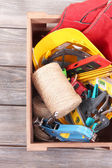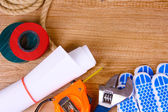 Narzędzia budowlane na drewnianym tle