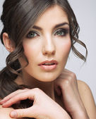 Piękna brunetka dziewczyna z wieczorny make-up i doskonałej skóry. Piękna twarz.