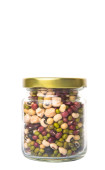 Wymieszać fasoli podbite oko grochu, fasoli mung, fasola adzuki, soi, czarna fasola i fasola czerwona w słoiku mason na białym tle