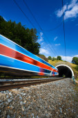 Zdjęcie "Szybki pociąg przechodzi przez tunel w piękny letni dzień" może być wykorzystywane do celów osobistych i komercyjnych zgodnie z warunkami zakupionej licencji Royalty-free. Obraz jest dostępny do pobrania w jakości wysokiej rozdzielczości do 5760x3840.