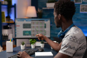 Zespół techników współpracujących z techniką uczenia maszynowego, rozwijający sztuczną inteligencję, wprowadzający innowacyjne systemy autonomiczne. Współpracownicy IT pracujący w zespole w biurze przekształcają dane w modele prognostyczne