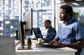 Zdjęcie "Zespół techników współpracujących z techniką uczenia maszynowego, rozwijający sztuczną inteligencję, wprowadzający innowacyjne systemy autonomiczne. Współpracownicy IT pracujący w zespole w biurze przekształcają dane w modele prognostyczne" może być wykorzystywane do celów osobistych i komercyjnych zgodnie z warunkami zakupionej licencji Royalty-free. Obraz jest dostępny do pobrania w jakości wysokiej rozdzielczości do 5760x3840.