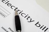 Obraz przedstawia wysoki rachunek za prąd, zapaloną żarówkę i stos monet, symbolizujących obciążenie finansowe rosnących kosztów energii oraz wpływ na budżety gospodarstw domowych..