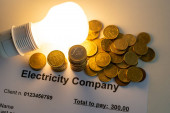 Zdjęcie "Obraz przedstawia wysoki rachunek za prąd, zapaloną żarówkę i stos monet, symbolizujących obciążenie finansowe rosnących kosztów energii oraz wpływ na budżety gospodarstw domowych.." może być wykorzystywane do celów osobistych i komercyjnych zgodnie z warunkami zakupionej licencji Royalty-free. Obraz jest dostępny do pobrania w jakości wysokiej rozdzielczości do 5760x3840.
