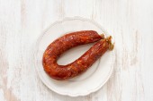 Chourico on dish on white dish on blue wooden background