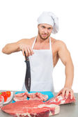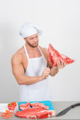 kulturysta szef kuchni przygotowuje się duże kawałki surowego mięsa.