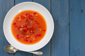Zdjęcie "Gaspacho on plate on white wooden background" może być wykorzystywane do celów osobistych i komercyjnych zgodnie z warunkami zakupionej licencji Royalty-free. Obraz jest dostępny do pobrania w jakości wysokiej rozdzielczości do 5760x3840.
