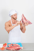 kulturysta szef kuchni przygotowuje się duże kawałki surowego mięsa.