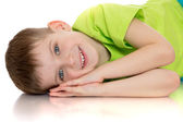 The child sits on the floor with folded legs under him