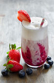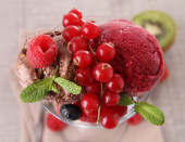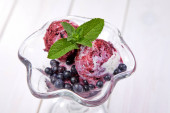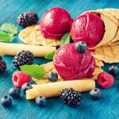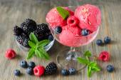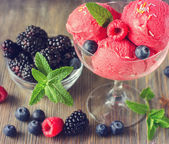 Red ice cream with berries, sorbet on wooden dark background