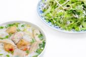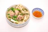 Bun cha ca lub wietnamski makaron ryżowy z grillowanych ryb i zioła na białym tle