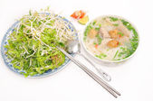Bun cha ca lub wietnamski makaron ryżowy z grillowanych ryb i zioła na białym tle