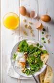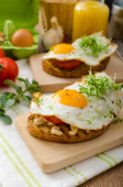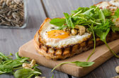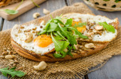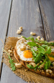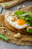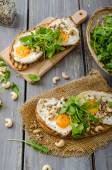 pão da aldeia, ovos fritos, assado nozes e salada pequena em cima, simples, mas delicioso