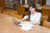 Zdjęcie "Kobieta studentka z biblioteki z laptopa" może być wykorzystywane do celów osobistych i komercyjnych zgodnie z warunkami zakupionej licencji Royalty-free. Obraz jest dostępny do pobrania w jakości wysokiej rozdzielczości do 5760x3840.