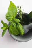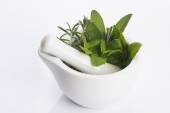 moździerz z ziołami na białym tle na białym tle