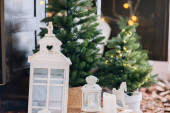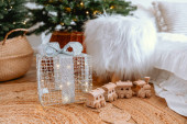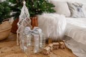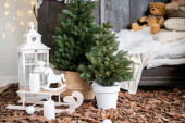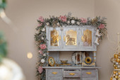 Uroczy kącik prezentuje ciemną szafę wypełnioną dekoracyjnymi przedmiotami, w tym misiami i małymi wiecznie zielonymi drzewkami. Miękkie tkaniny i ciepłe światła tworzą przytulną wakacyjną atmosferę.