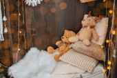 Zdjęcie "Uroczy kącik prezentuje ciemną szafę wypełnioną dekoracyjnymi przedmiotami, w tym misiami i małymi wiecznie zielonymi drzewkami. Miękkie tkaniny i ciepłe światła tworzą przytulną wakacyjną atmosferę." może być wykorzystywane do celów osobistych i komercyjnych zgodnie z warunkami zakupionej licencji Royalty-free. Obraz jest dostępny do pobrania w jakości wysokiej rozdzielczości do 5760x3840.