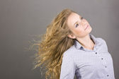 Red-haired girl in the bright sun. Portrait of a young girl outdoors. Girl on a background of green trees