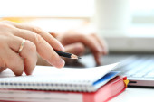 Close-up of female hands with laptop, smartphone and notebook
