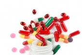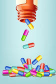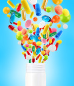 różne tabletki latający od otwarcia butelki z tworzyw sztucznych na białym tle