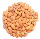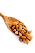 Migdałowy migdały w drewnianą łyżką, na białym tle.