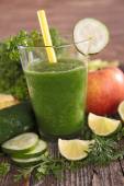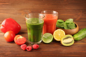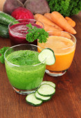 Asortyment zdrowe świeże soki na drewnianym stole, na jasnym tle
