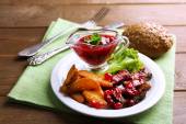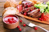Wołowina z sosem żurawinowym, ziemniaki pieczone plastry i kok na deski do krojenia, na tle drewniane