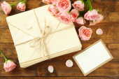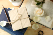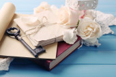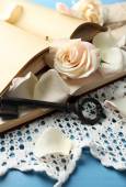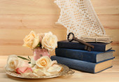 świeżych róż ze starej książki, klucz i litery na tle drewniany stół. koncepcja Vintage