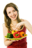 Zdrowa młoda kobieta z warzywami na widelec na białym tle