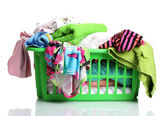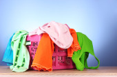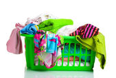kobieta trzyma koszyka z sterty różnych ubrań, na tle ściany cegieł