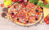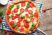 Pizza z bazylią i pomidorkami na pergamin na drewnianym stole, zbliżenie