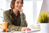 Cute businesswoman trzyma gazetę siedzi przy biurku w biurze