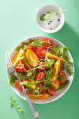 Zdjęcie "pomidor sałatka z rukoli na zielonym tle" może być wykorzystywane do celów osobistych i komercyjnych zgodnie z warunkami zakupionej licencji Royalty-free. Obraz jest dostępny do pobrania w jakości wysokiej rozdzielczości do 5760x3840.