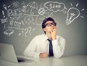 woman with computer thinking dreaming has ideas looking up
