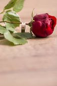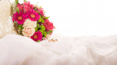 Beautiful colorful bouquet of flowers and two wedding rings on w