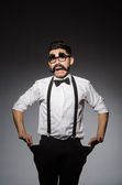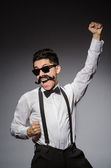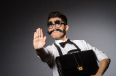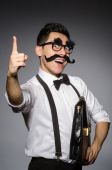 Młody człowiek z fałszywych wąsy gospodarstwa sprawy na szarym tle