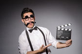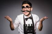 młody człowiek z fałszywych wąsy gospodarstwa clapperboard na szarym tle
