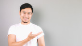 Wskazując na puste miejsce z szczęśliwy twarz uśmiech.