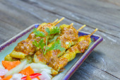 Pork Satay, Traditional Thai steak roasted pork on wood table