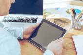 mężczyzna trzyma cyfrowego tabletu w miejscu pracy